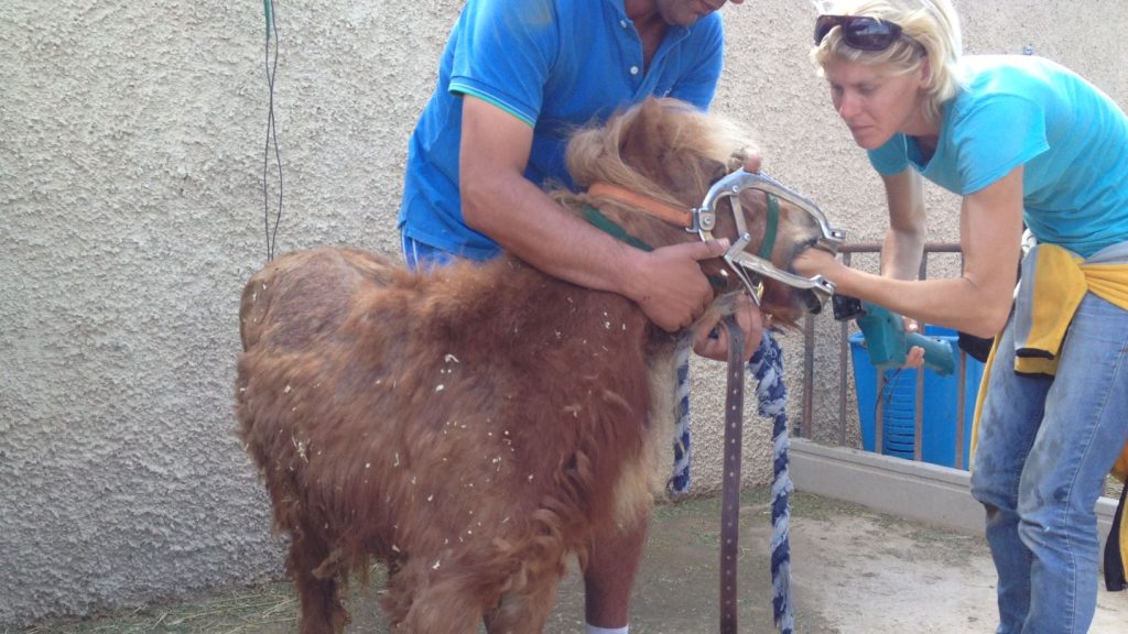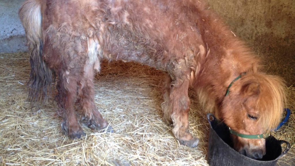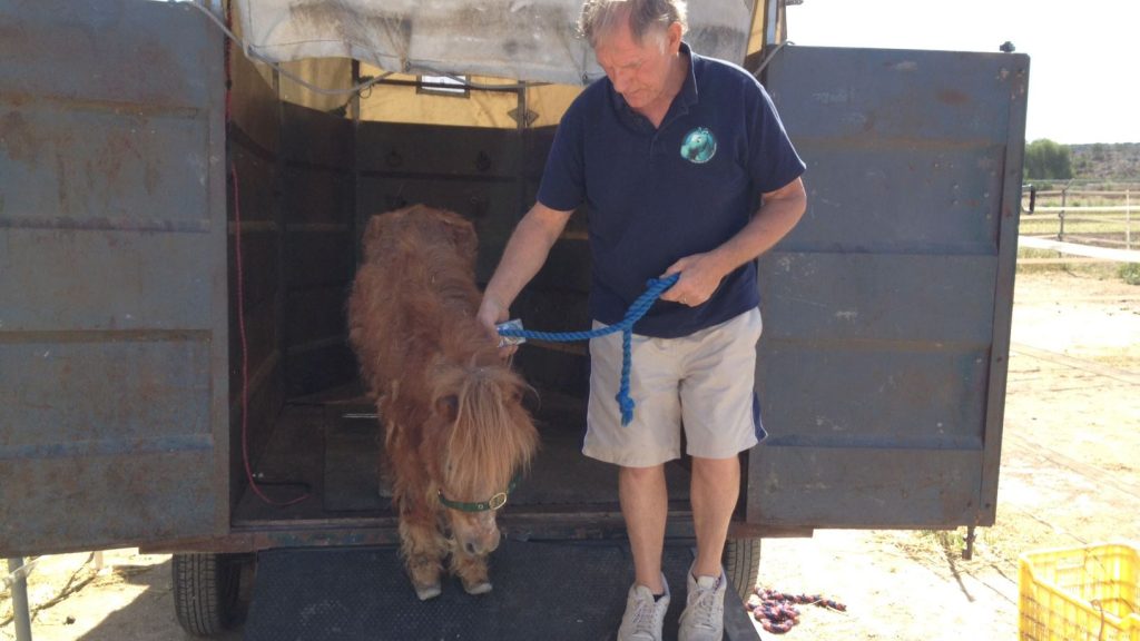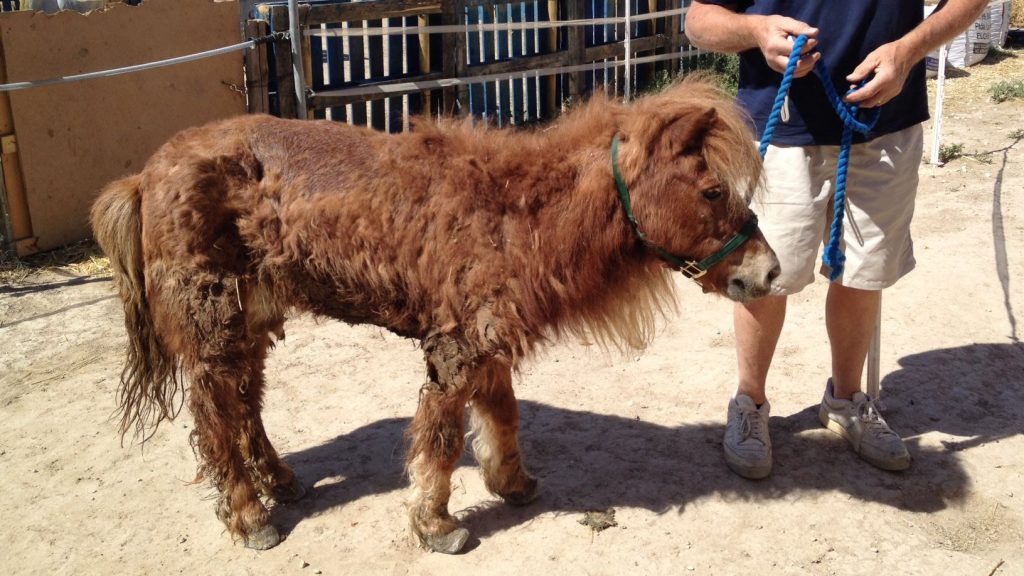 Sherrie fue encontrada abandonada en una plantación de palmas, atada con cuerdas de pacas alrededor de sus patas y cuello. Estaba sufriendo de laminitis grave, las venas se habían secado y no había tratamiento posible, ya que los huesos en sus cascos habían muerto.