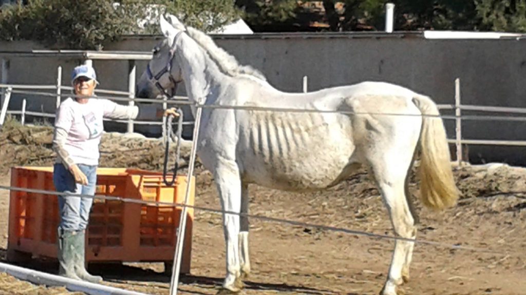 One spring day we received a call from the local Callosa de Segura police about a horse left to starve near the railway line. We headed down to the site with two officers and found Bella tied to a tree, extremely emaciated and in really bad condition.